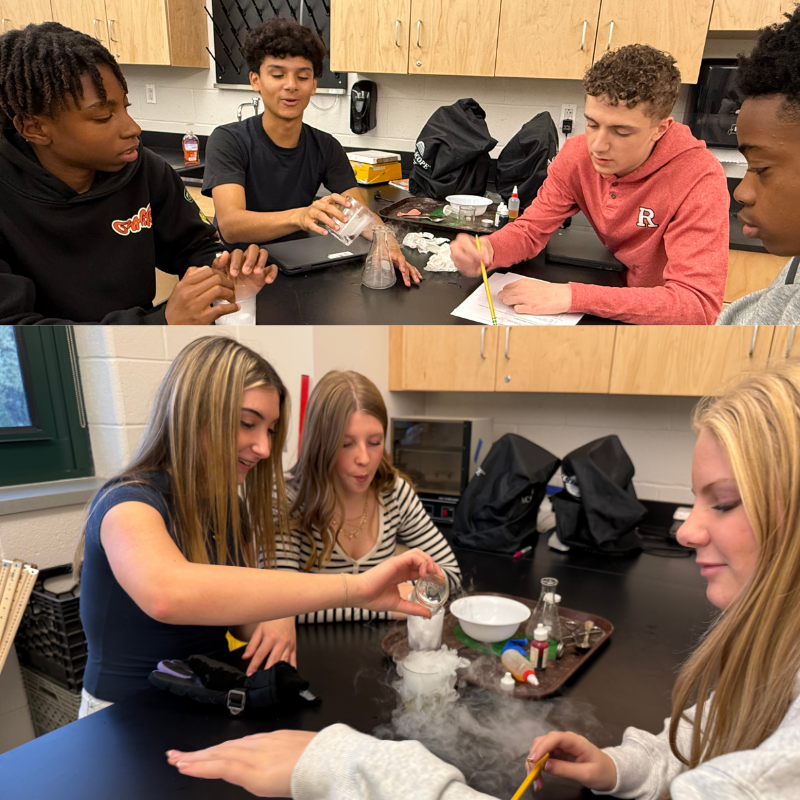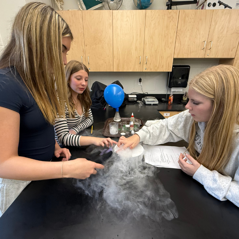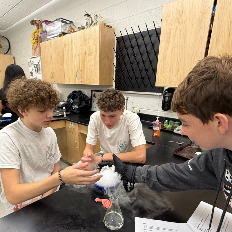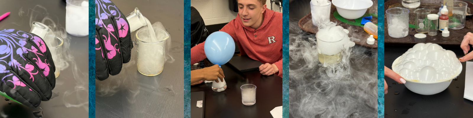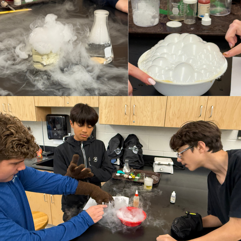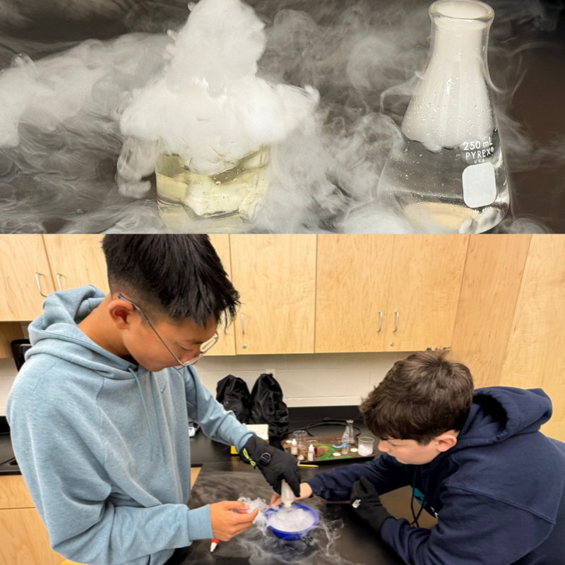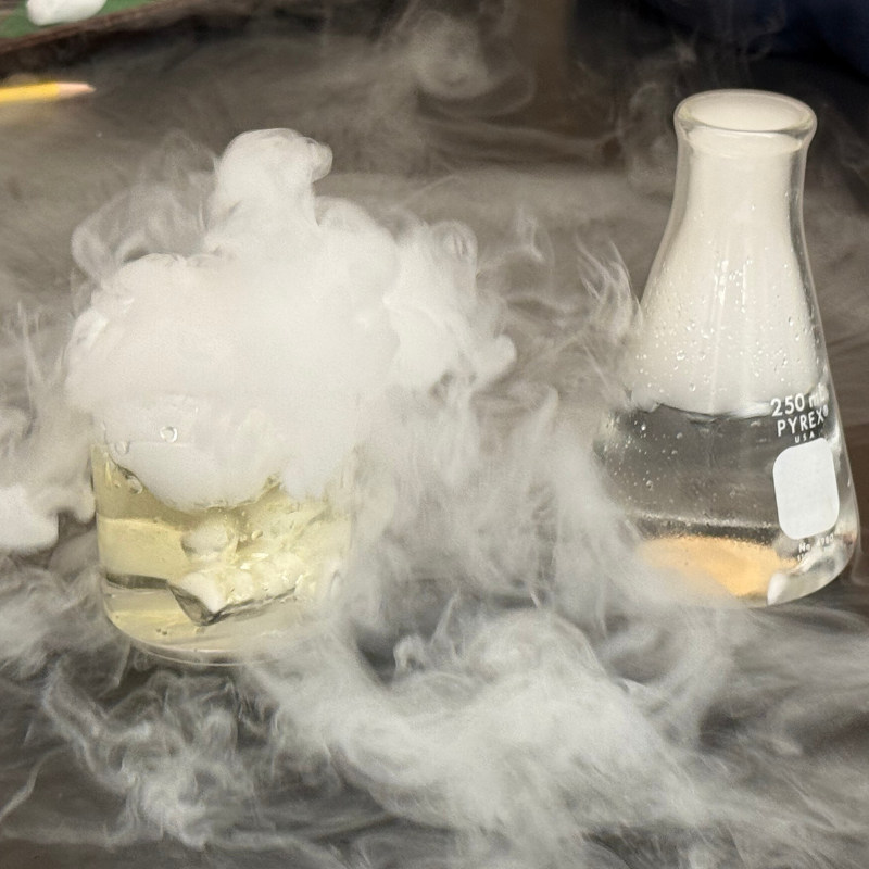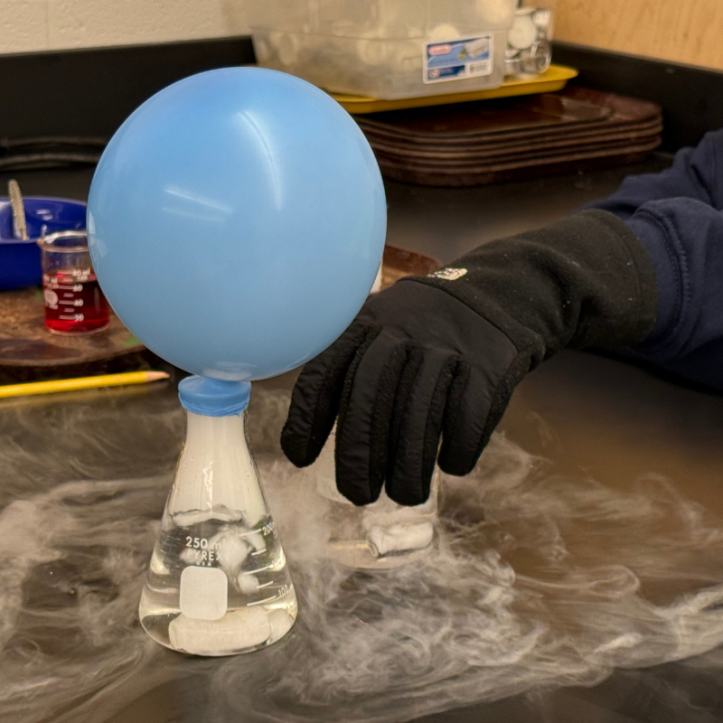 8th-grade students wrapped up their unit on States of Matter and Phase Changes by doing a series of mini-experiments with dry ice. Dry ice is solid CO2 and is unique in that it goes directly from the solid state to the gaseous state in a process called sublimation.  Students enjoyed the opportunity to work with dry ice by using it to inflate balloons, extinguish candle flames, make mini-rockets, and, of course, create spooky fog, which coincided with Halloween.
